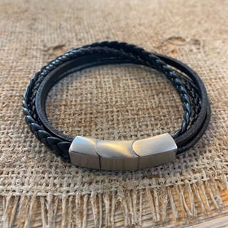 Beskrivelse Armbånd i fire deler med ulikt utseende og dekor detaljer. En i stål. Enkel klipslås som kan justere størrelsen. Bredde: 10mm, hver linje ca. 3mm, 4mm & 5mm Materiale: Lær, stål |