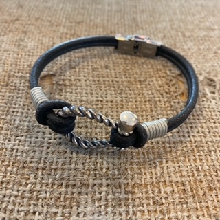 Armbånd med detaljer og lær i en svart farge. Enkel klipslås.