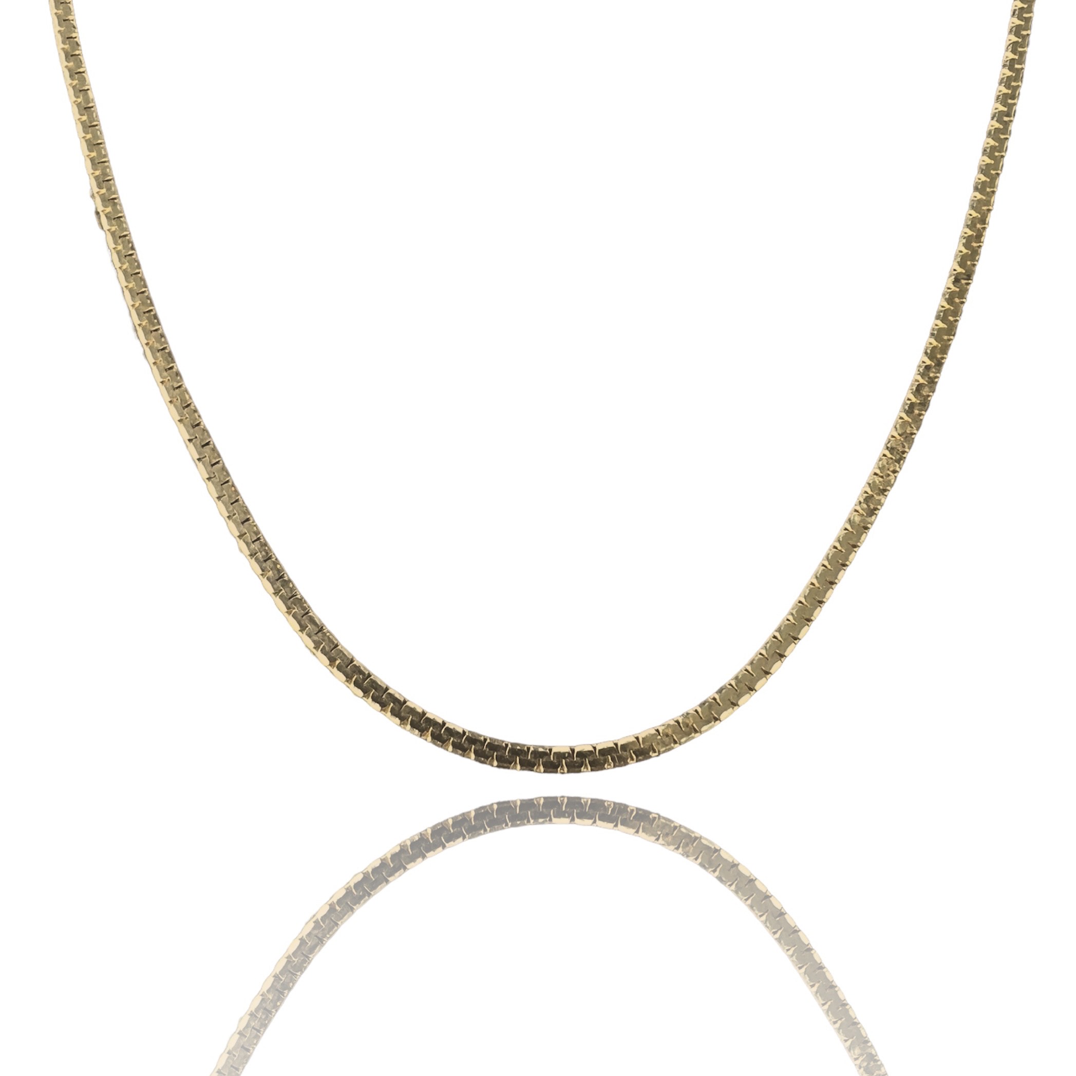 Beskrivelse Dette er smykker som har vært brukt, noe som gjør produktene rimligere enn å kjøpe det nytt. Det er derfor alltid noe slitasje og historie. Dette er et fantastisk tilbud som støtter gjenbruk og gir deg unike smykker. Alle smykkene er kvalitetsjekket, vasket, renset og polert opp av oss i butikken! Kommer i en flott eske. Med karabin lås. Lengde: 41cm Vekt: 6,1g Bredde: 2mm Metall: 585 Gult gull |