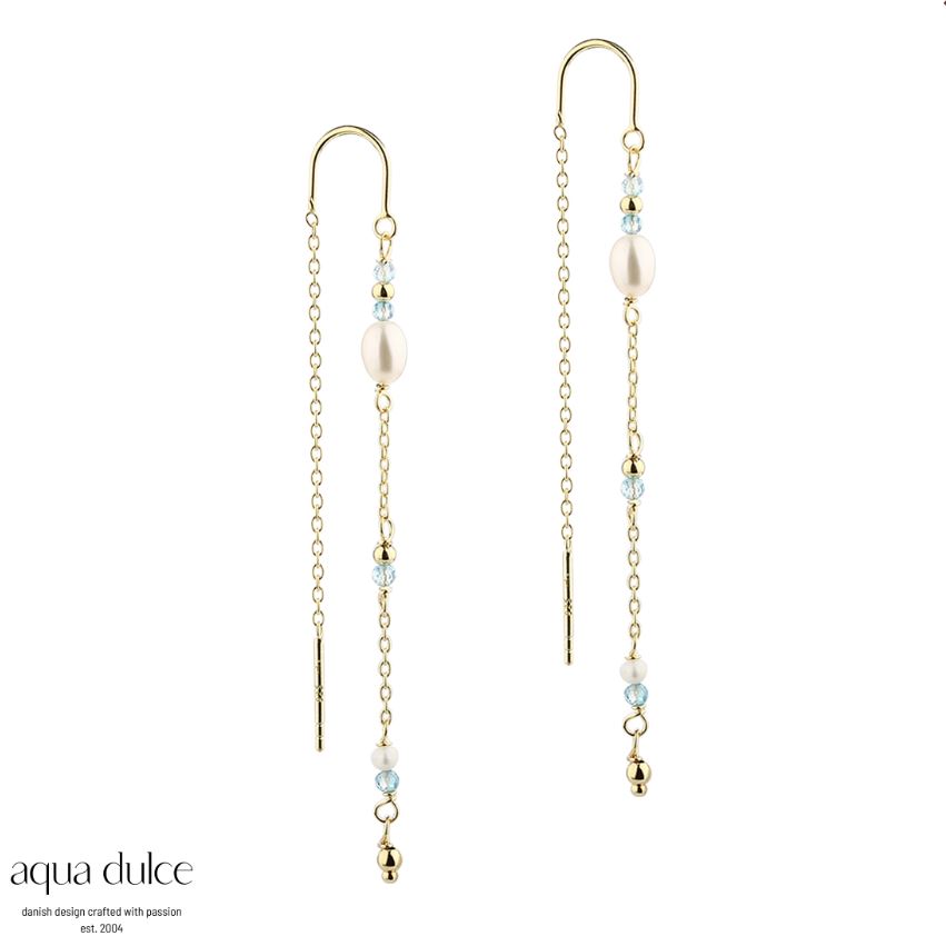 Beskrivelse Hvite ferskvannsperler, blå perler og små forgylte sølvkuler. - 100 % nikkelfri - 925 Sterling sølv, forgylt - Lengde: 6cm |