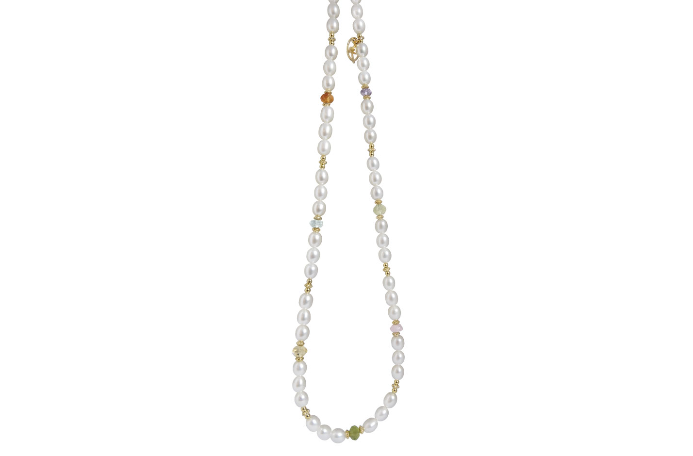 Beskrivelse Sterling sølv, forgylt Hvite ferskvannsperler, citrin, karneol, ametyst, peridot, rosenkvarts, turmalinkvarts, akvamarin Lengde: 45 cm Bilde lånt fra leverandør nettside: www.rabinovich.dk |