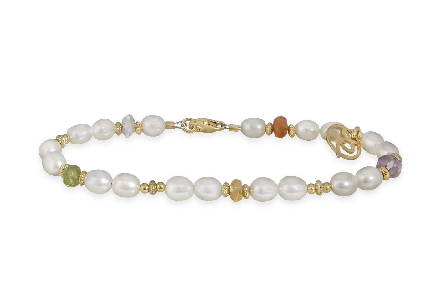 Beskrivelse Sterling sølv, forgylt Hvite ferskvannsperler, citrin, karneol, ametyst, peridot, rosenkvarts, turmalinkvarts, akvamarin Lengde: 19 cm Bilde lånt fra leverandør nettside: www.rabinovich.dk |