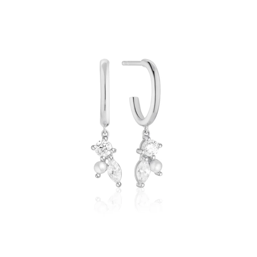 Beskrivelse Øreringer i rhodinert 925 sterlingsølv med blankpoleret overflate, håndsatt med hvite faseterte zirkoner og perle. Øreringenes mål: Diameter 13 mm, lengde 24,5 mm, bredde 1,8 mm, tykkelse 1,6 mm |