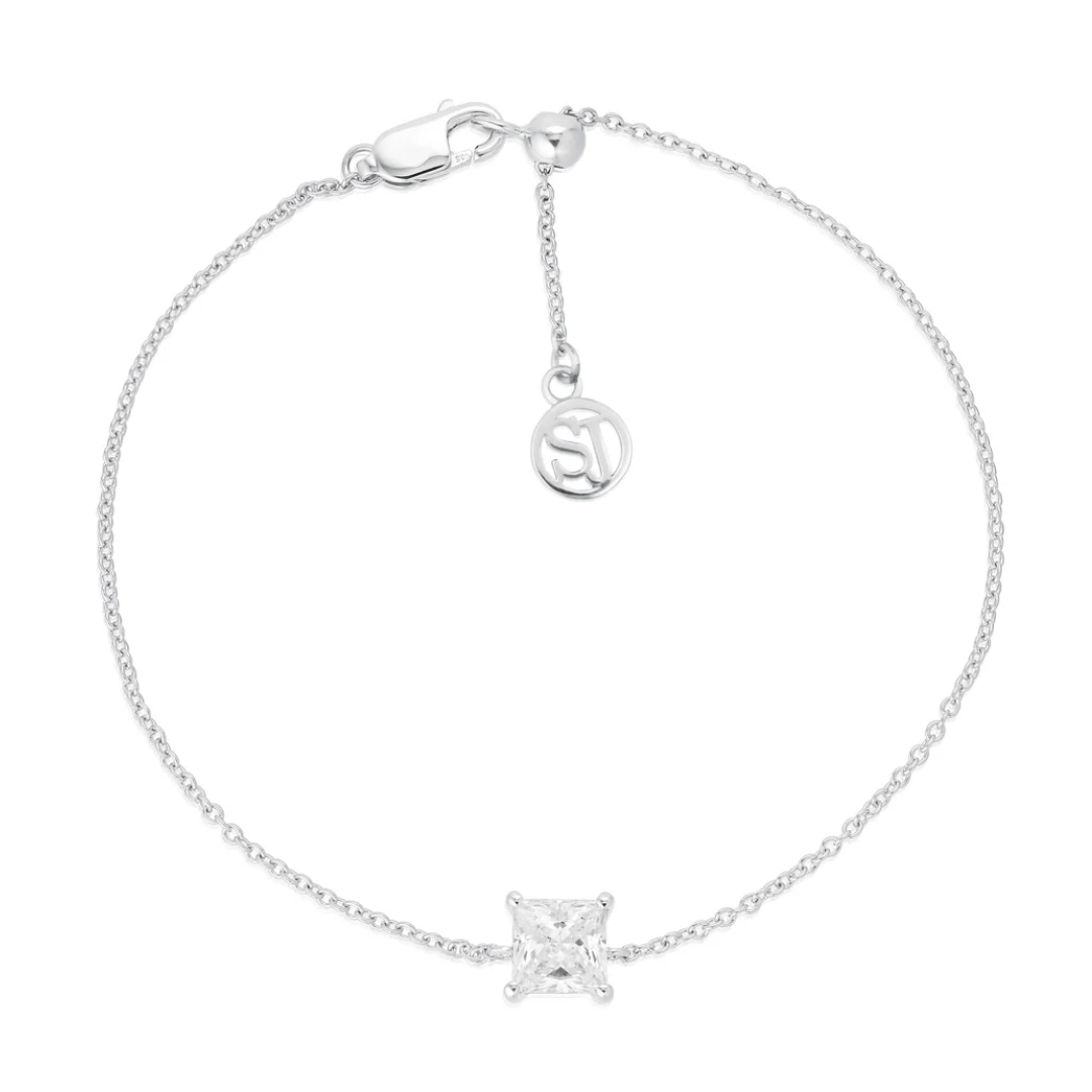 Beskrivelse Armbånd i rhodineret 925 sterlingsølv med blankpoleret overflate, håndsatt med hvide fasiterte zirkoner. Anhengets mål: Bredde 4 mm Lengde: Kan strammes opp til 19 cm - justerbar |