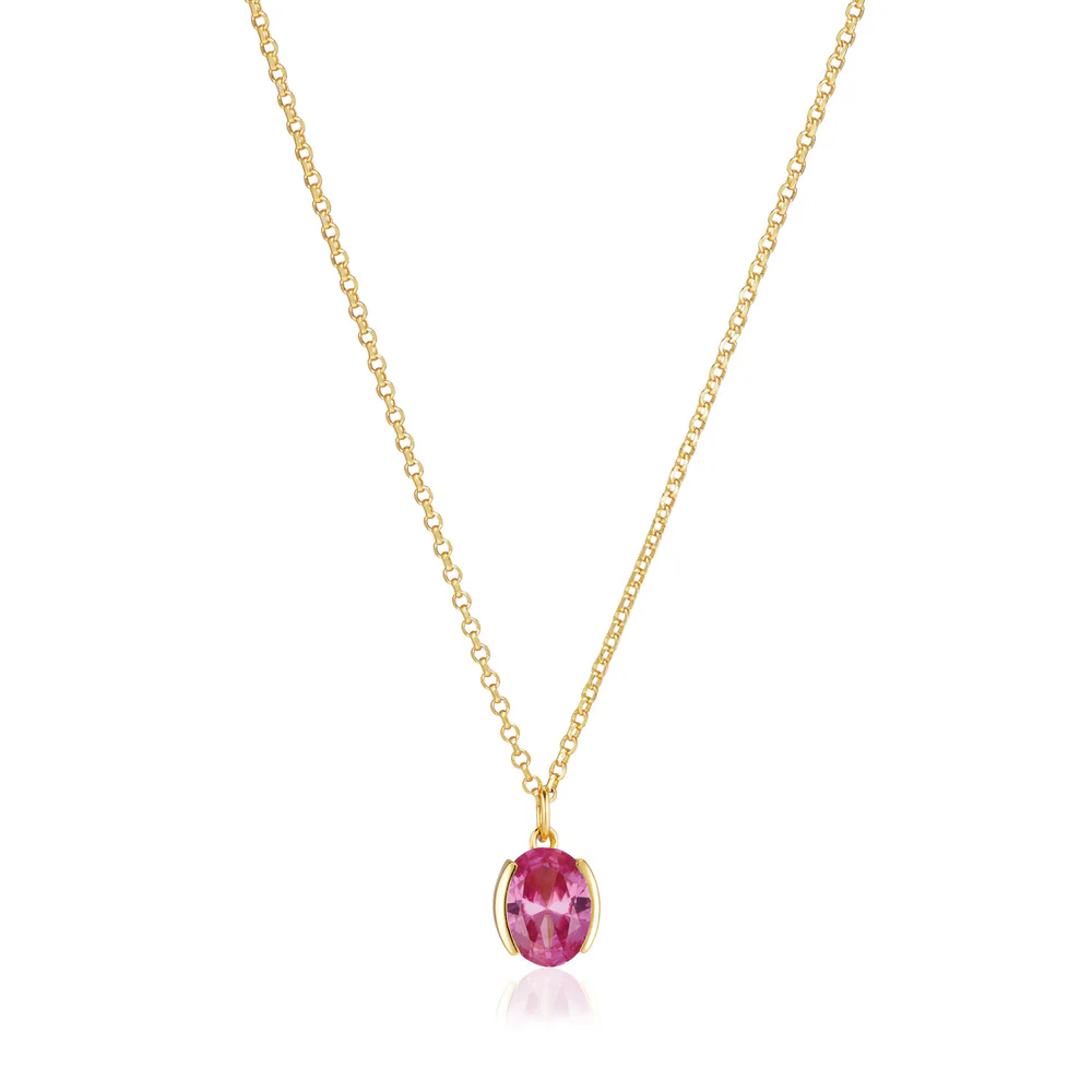 Beskrivelse Halskjede laget av 18 karat forgylt 925 sterlingsølv, polert overflate og håndsett med fasettslipte rosa zirkoner. Halskjedemål: Lengde 12 mm, bredde 7 mm Kjedelengde: opptil 45 cm - justerbar |