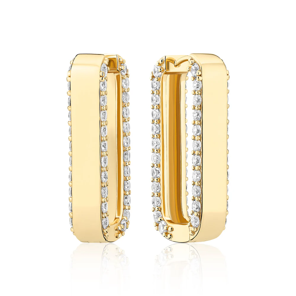 Beskrivelse Øredobber laget av 18 karat forgylt 925 sterlingsølv, polert overflate og håndsett med fasettslipte hvite zirkoner. Mål på øredobber: Lengde 30 mm, bredde 5 mm, tykkelse 2,5 mm |