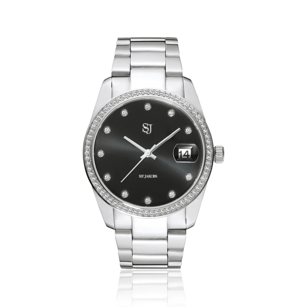 Beskrivelse Klokke laget av rustfritt stål, polert og børstet overflate, safirglass med forstørrelsesglass og hvit zirkonia i svart solskive og safirglass. Vannmotstand 50 m. Bevegelse Miyota. Klokkemål: Urskive - Diameter 36 mm, tykkelse 10,5 mm. Armbånd - Lengde 18,5 cm, bredde 18 mm, tykkelse 3,4 mm |
