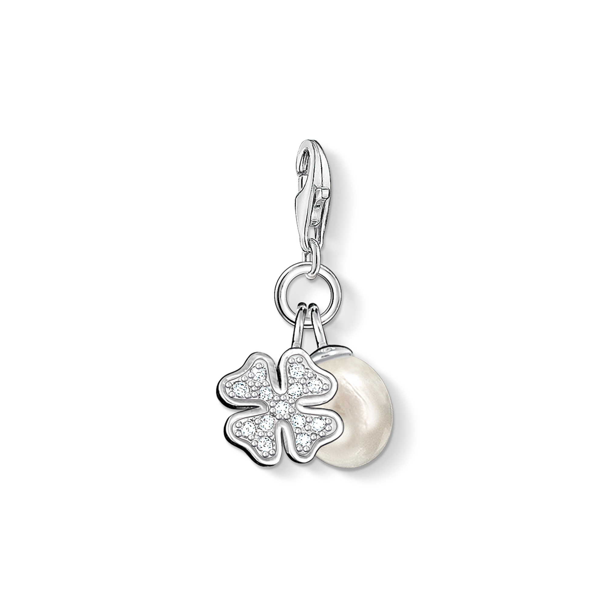 Beskrivelse Thomas Sabo Charm Club - Cloverleaf with pearl Charm Material: Sølv, 925 Stein: Cubic zirkonia & ferskvannsperle Lås: Karabinlås Høyde: ca.27,00 mm Bredde: ca. 13,00 mm Formue elegant tolket: zirkonia pyntet kløverblad med en dyrket ferskvannsperle. |