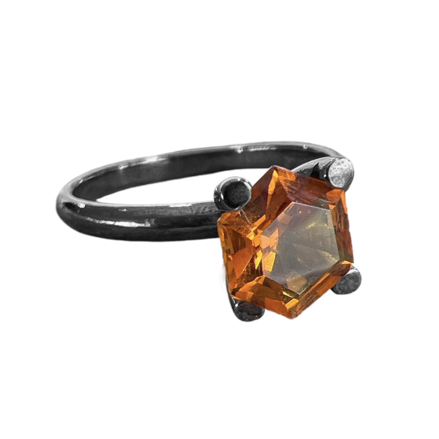 Beskrivelse Jubileumsringer laget for åfeire våre 30 år. Dette er en serie ringer med bare ekte steiner som er håndlaget hos oss. Hver ring er derfor helt unik. Ringene er laget i sølv, oksidert & 14.kt gull. Fine å sette sammen til en ringbukett. Material: Sølv 925, oksidert Stein: Citrin, sekskant - 6mm x 6mm Ringskinne 2,2mm |