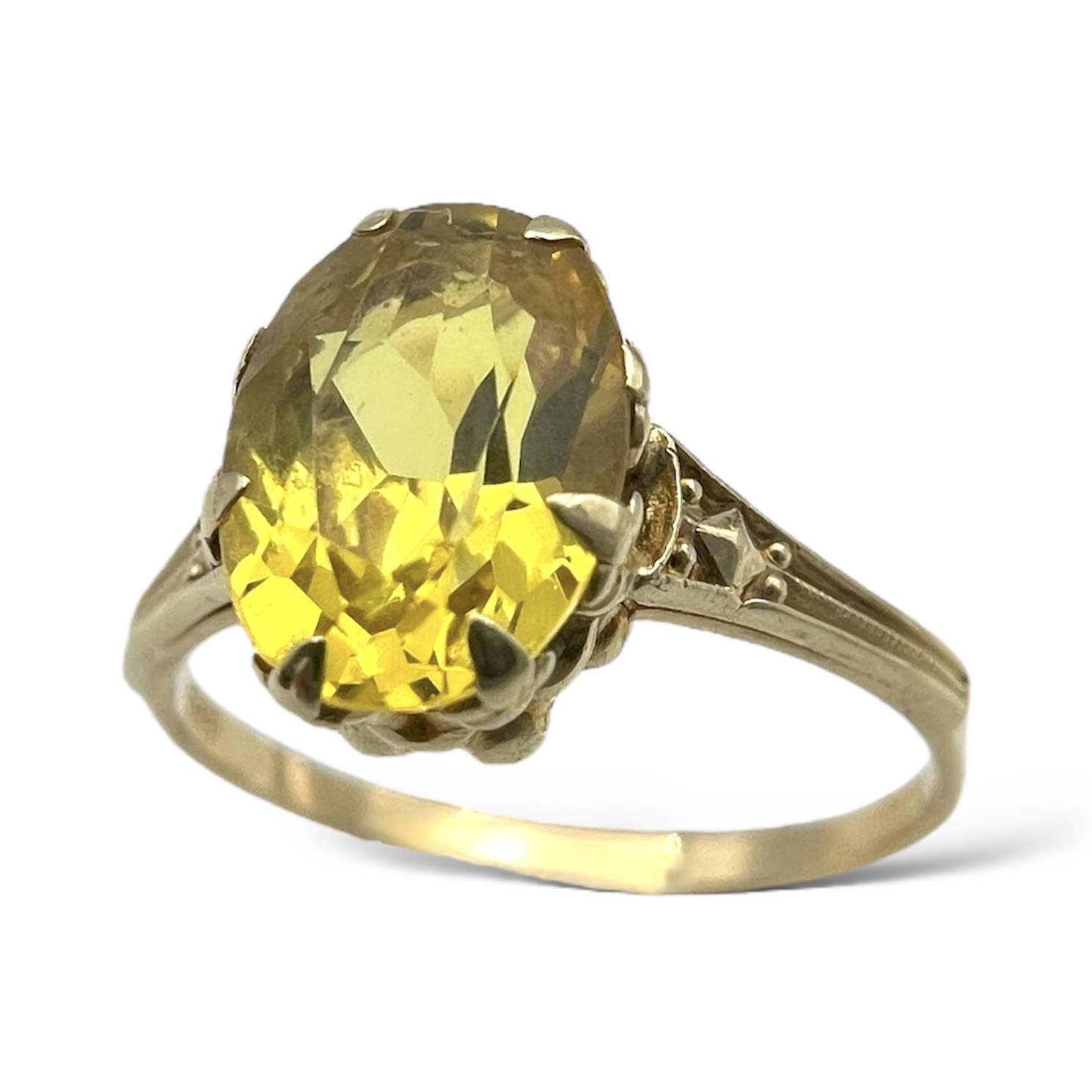 Beskrivelse Dette er smykker som har vært brukt, noe som gjør produktene rimligere enn å kjøpe det nytt. Det er derfor alltid noe slitasje og historie. Dette er et fantastisk tilbud som støtter gjenbruk og gir deg unike smykker. Alle smykkene er kvalitetsjekket, vasket, renset og polert opp av oss i butikken! Kommer i en flott eske. Lite brukt, fint hold! Material: 585 gull Bredde: ca. 8m Høyde: ca. 1cm Stein: Citrin Vekt: 2,2g Ring størrelse: 54 Stempel: 585 & ukjent ansvarstempel. |