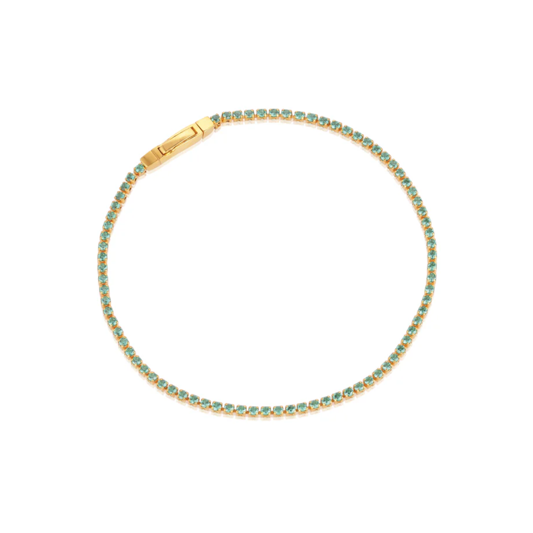 Beskrivelse Tennisarmbånd laget av 18 karat forgylt 925 sterlingsølv, poleret overflate, og innfattet med fasiterte turkisfargede zirkoner. Armbåndets mål: Bredde 1,3 mm, tykkelse 1,5 mm Lengde inkl. lås 16 cm |
