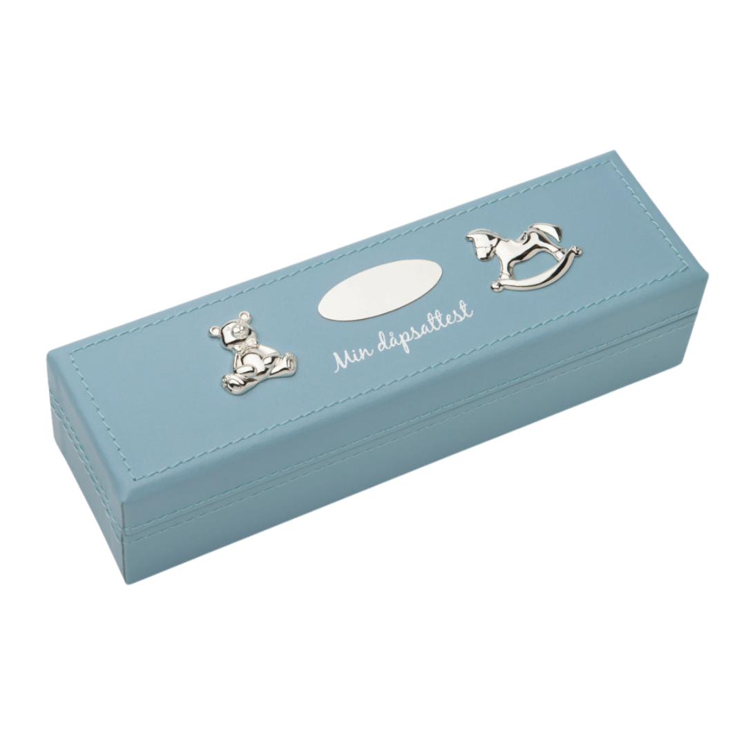 Beskrivelse Dåpsattestboks "Min dåpsattest" i lys blå imitert skinn med preget mønster. Størrelse: 8x24cm KAN GRAVERES! Lokket kan graveres. Legg til det du ønsker å gravere her og skriv i kommentarfeltet i handlekurven hva du ønsker å gravere. Ta kontakt om det skal graveres noe annet. |