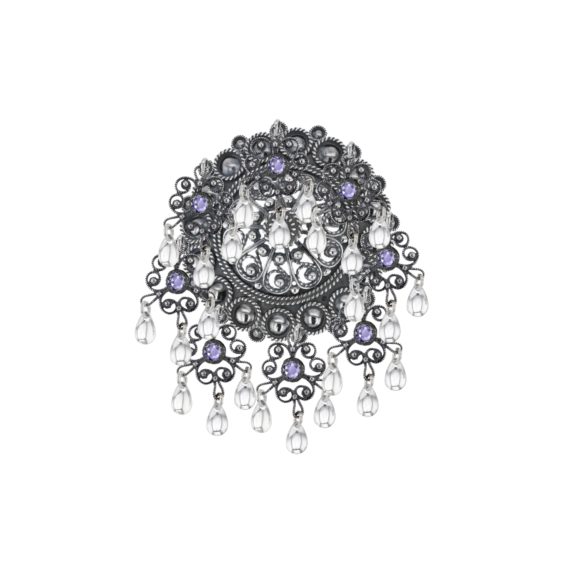 Sølje med rose i midten og nyreheng med krystall, farge lilla 37.