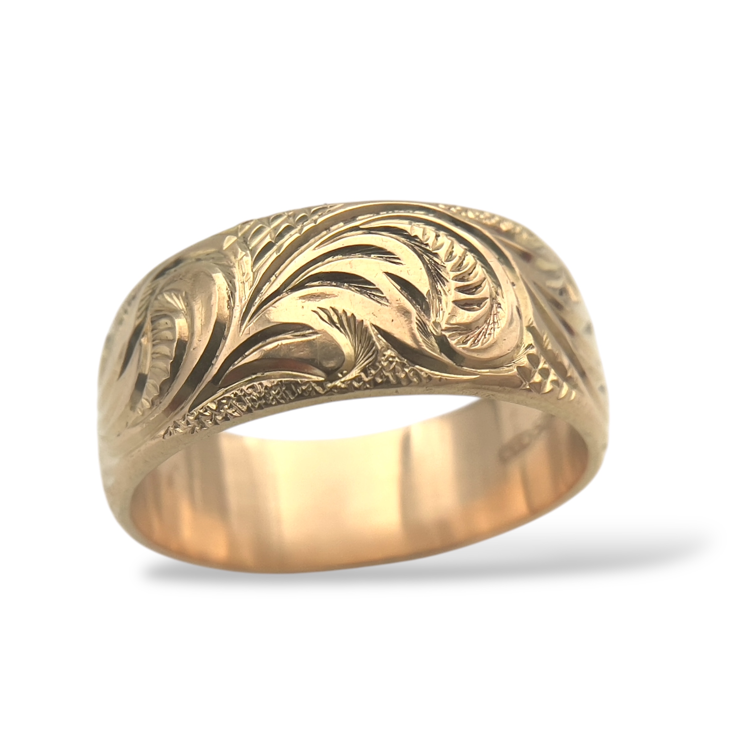 Beskrivelse Dette er smykker som har vært brukt, noe som gjør produktene rimligere enn å kjøpe det nytt. Det er derfor alltid noe slitasje og historie. Dette er et fantastisk tilbud som støtter gjenbruk og gir deg unike smykker. Alle smykkene er kvalitetsjekket, vasket, renset og polert opp av oss i butikken! Kommer i en flott eske. Fjernet gravering og i fin tillstand. Material: 585 Gult gull Bredde: 7,7mm Vekt: 6,9g Ring størrelse: 59 Stempel: 585 & Ivar Nielsen (Oslo) sitt mesterstempel. Produksjon fra 1897-1999, Oslo |