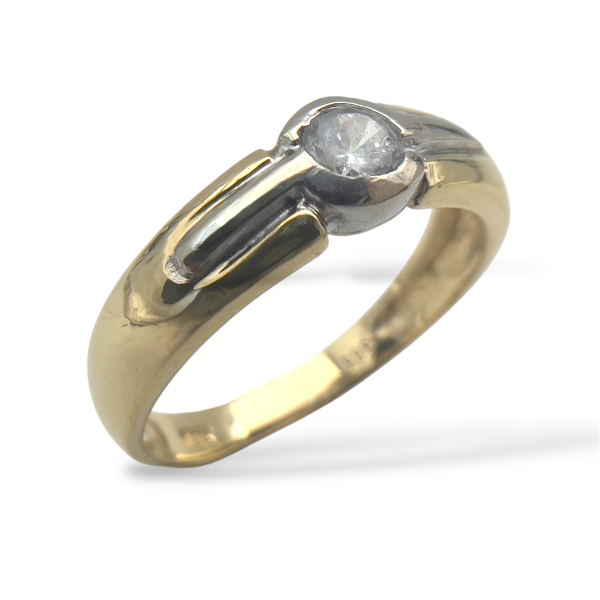 Beskrivelse Dette er smykker som har vært brukt, noe som gjør produktene rimligere enn å kjøpe det nytt. Det er derfor alltid noe slitasje og historie. Dette er et fantastisk tilbud som støtter gjenbruk og gir deg unike smykker. Alle smykkene er kvalitetsjekket, vasket, renset og polert opp av oss i butikken! Kommer i en flott eske. Material: 585 Gult gull & Hvit gull Bredde ringskinne: 2,8mm - 5,2mm Stein: Zirkonia, litt slitt stein. Vekt: 2,94g Ring størrelse: Liten 56 Stempel: 585 & 14k, ikke noe mesterstempel. |