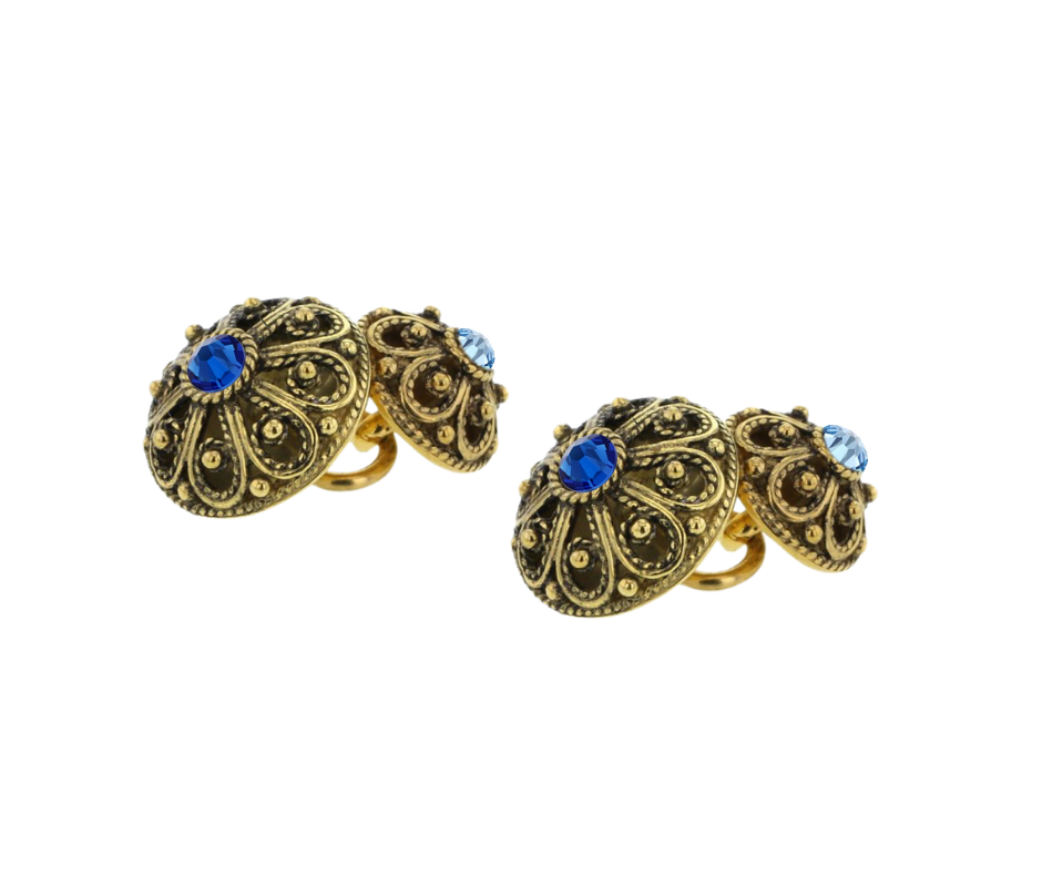 Beskrivelse Mansjettknappar med krystaller Sølv, gammel forgylt Stor + liten knapp Stor knapp H 0,85 cm D 1,6 cm - blå 02 krystall Liten knapp H 0,85 cm D 1,25 cm - lyseblå 13 krystall |