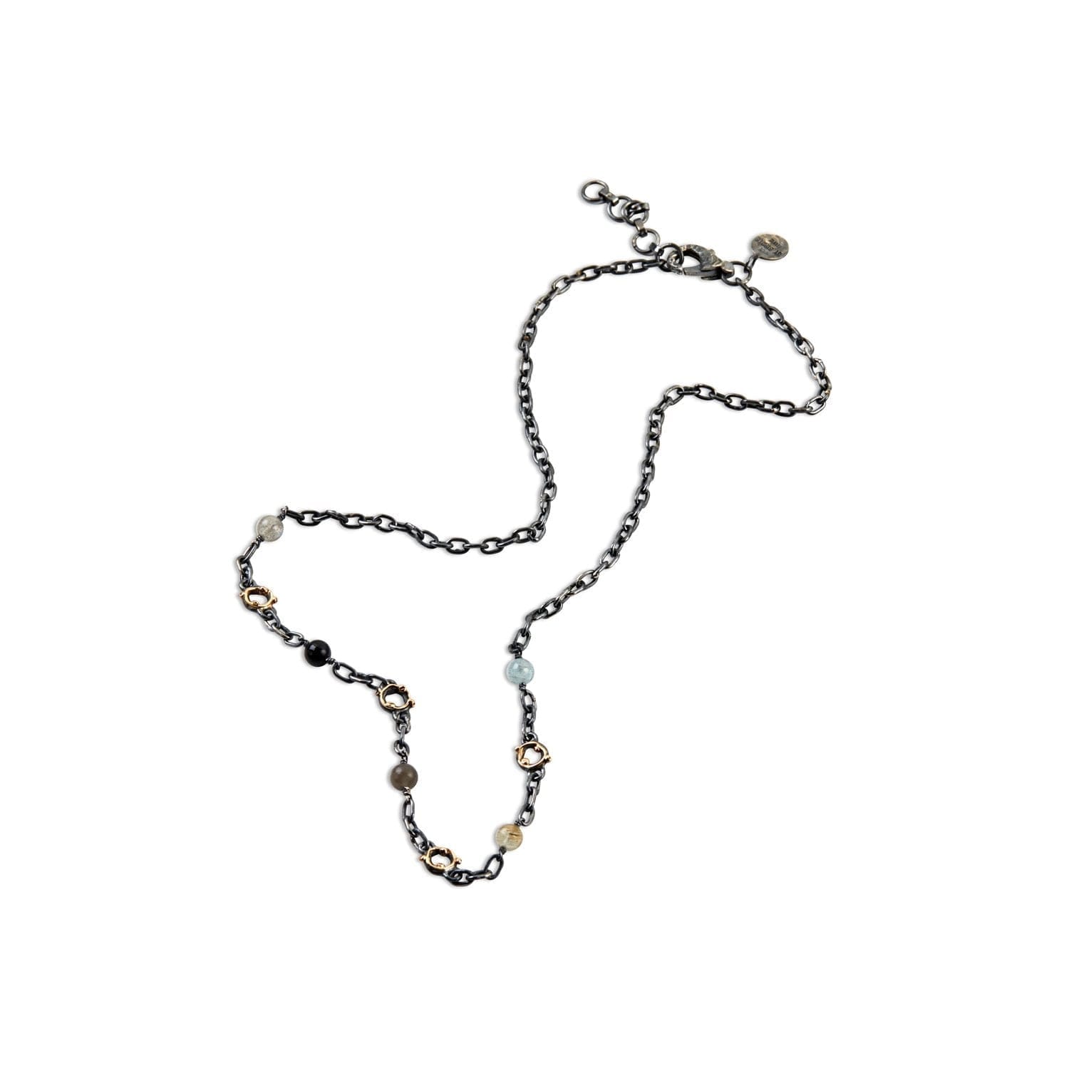Beskrivelse Om smykke: Zeus natursteinskjede er en håndlaget kjede opptil 50 cm lang, bestående av akvamarin, rutilkvarts, grå månestein, svart onyks og labradoritt. Et harmonisk og jordnært design med karakteristiske Zeus-ledd og signaturlås. Material: Sølv – 925 Sterling, Gull - 585 14kt. Overflate: Oksidert Steiner: Akvamarin, Labradorit, Månesten, Onyx, Kvarts Lengde: 46-50cm Kolleksjon: Zeus, Ocean Garden |