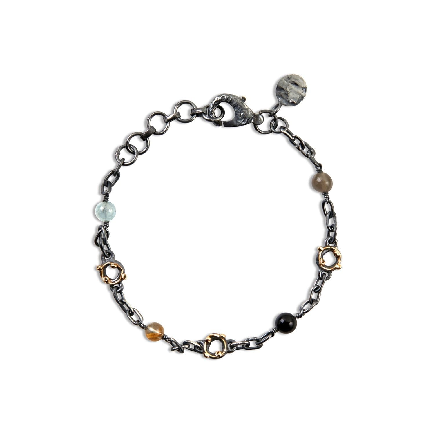 Beskrivelse Om smykke: Zeus natursteinsarmbånd er en håndlaget armbånd opptil 20 cm lang, bestående av akvamarin, rutilkvarts, grå månestein, svart onyks og labradoritt. Et harmonisk og jordnært design med karakteristiske Zeus-ledd og signaturlås. Material: Sølv – 925 Sterling, Gull - 585 14kt. Overflate: Oksidert Steiner: Akvamarin, Labradorit, Månesten, Onyx, Kvarts Lengde: 16-20cm Kolleksjon: Zeus, Ocean Garden |