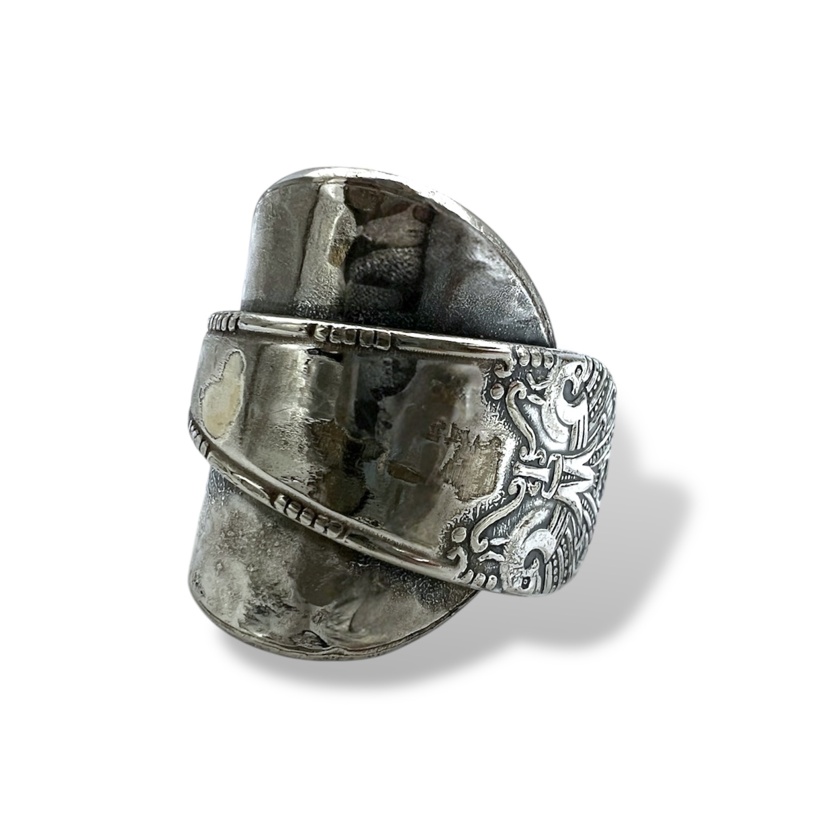 Beskrivelse Håndlaget på Klosterfoss Smykkeverksted. Teskje gjort om til et regulerbart blank oksidert ring. Overflate: Oksidert Material: 830 sølv Kan reguleres litt inn og ut. Historien bak serien! Vi er stolte over å kunne skape noe nytt av sølv med unik og spennende historie. Dette gir sølvbestikk nytt liv! Disse er perfekte til feks en bunad eller festdrakt. |