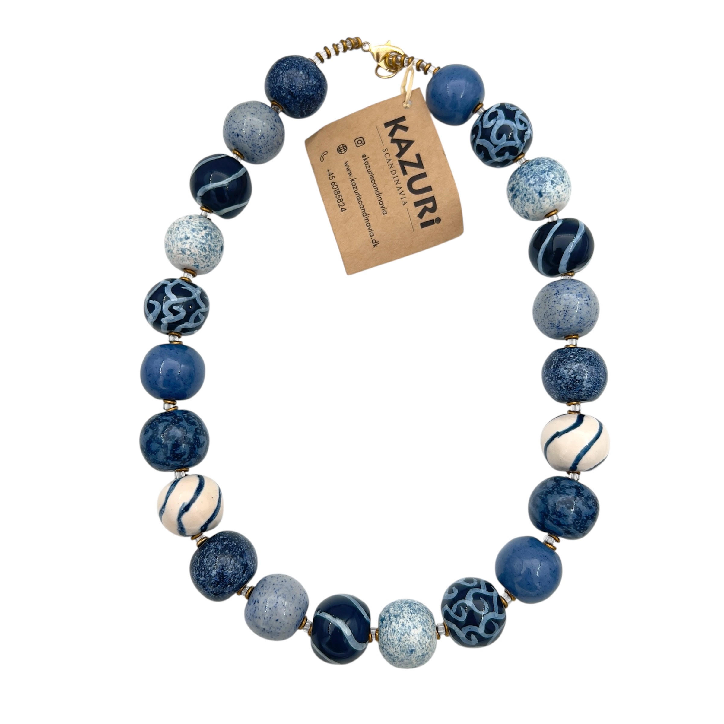 Beskrivelse Perlerne er trådet på fiskesnørre og låsen, samt mellemstykkerne er lavet i forgyldt kopper. Den er nikkelfri. Laget av keramink. Håndmalte perler fra Kenya. Perle bredde: 18mm Lengde: ca.48cm Bilde lånt fra www.KazuriSacndinavia.dk |