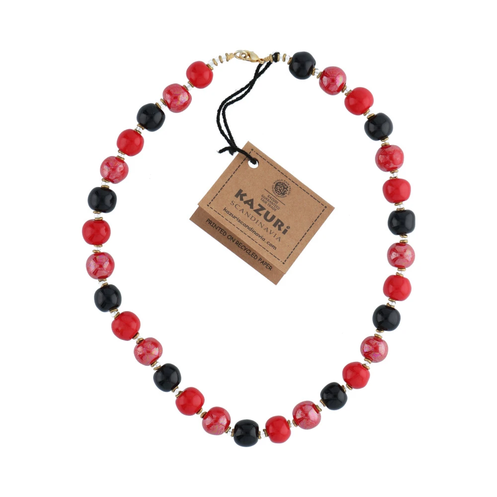 Beskrivelse Perlerne er trådet på fiskesnørre og låsen, samt mellemstykkerne er lavet i forgyldt kopper. Den er nikkelfri. Laget av keramink. Håndmalte perler fra Kenya. Perle bredde: ca.12mm Lengde: ca.48cm Bilde lånt fra www.KazuriSacndinavia.dk |