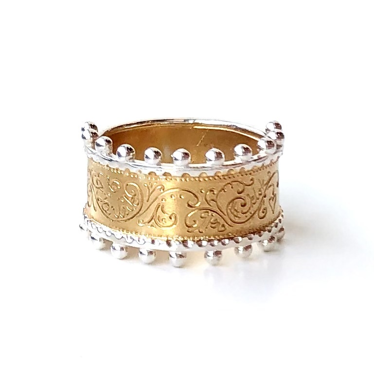 Beskrivelse Halldis ring er en vakker ring med sirlige graveringer. Sammen med Halldis hjertesølje er den tilegnet forfatter og lyriker Halldis Moren Vesaas. Gjemt i den lekne graveringen på utsiden av ringen finner du strofa “Kjærleik gjer klok” som er hentet fra diktet “lyset” av nettopp Halldis Moren Vesaas. Inni ringen er samme strofa gravert med tydelige bokstaver. Den finnes i både oksidert og forgylt versjon, og er 12mm bred. Vekt ca 7 gram. Siden dette er en bred ring, bør du beregne ett til to nr. større enn din vanlige ringstørrelse. |