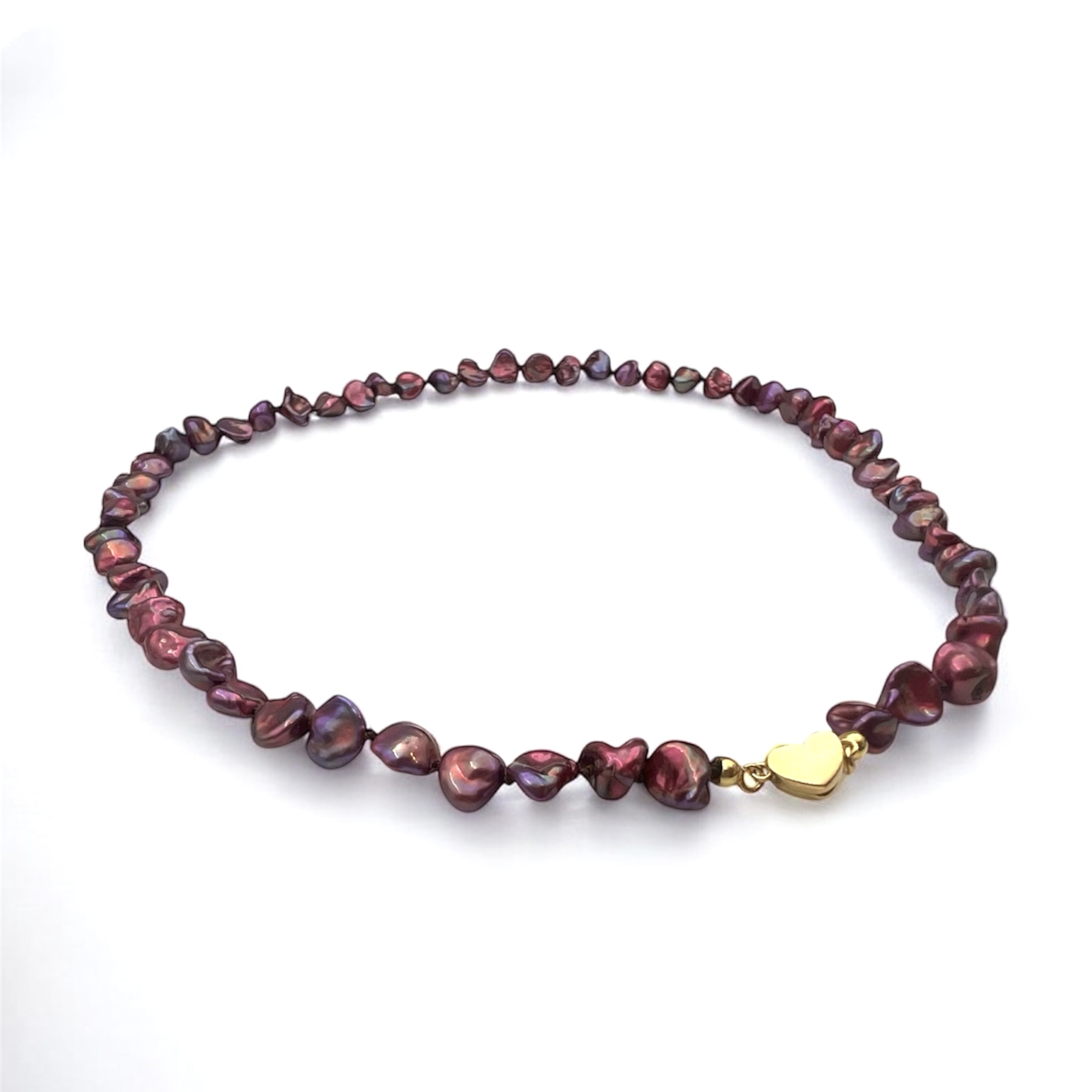 Beskrivelse Håndtred perlekjede hos oss! Ekte ferskvannsperler med med knuter. Ferskvannsperler i en dyp rosa/rød farge med brun tråd. Hjerte magnetlås med endefester, 925 forgylt sølv Lås størrelse: 7mm x 6,5mm Perle størrelse: ca. 6mm x 7mm Lengde: 43cm |