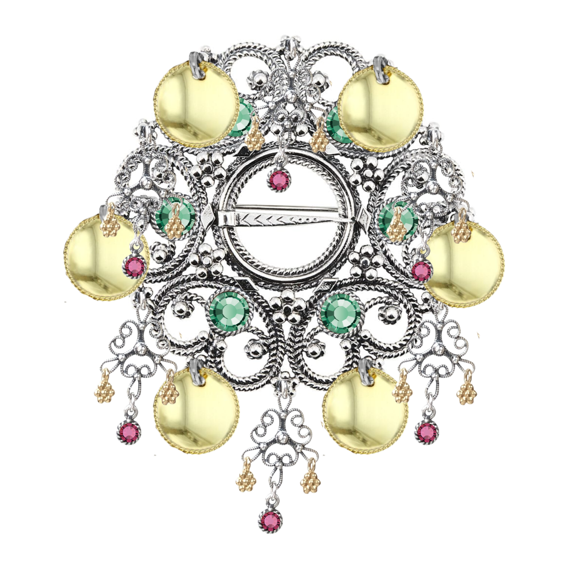 Beskrivelse En skjønn rosesølje med en mengde nydelige detaljer: krystaller, filigransblomster og bittesmå, forgylte blomsterheng i tillegg til “snippdemanter” og blomster av sølvkuler rundt midten av sølja. Denne gjør seg virkelig på bunaden eller fantasistakken! Stor stein i farge erinite og små i indian pink. Bredde 65 mm, lengde 85 mm. vekt ca 38 gram. |