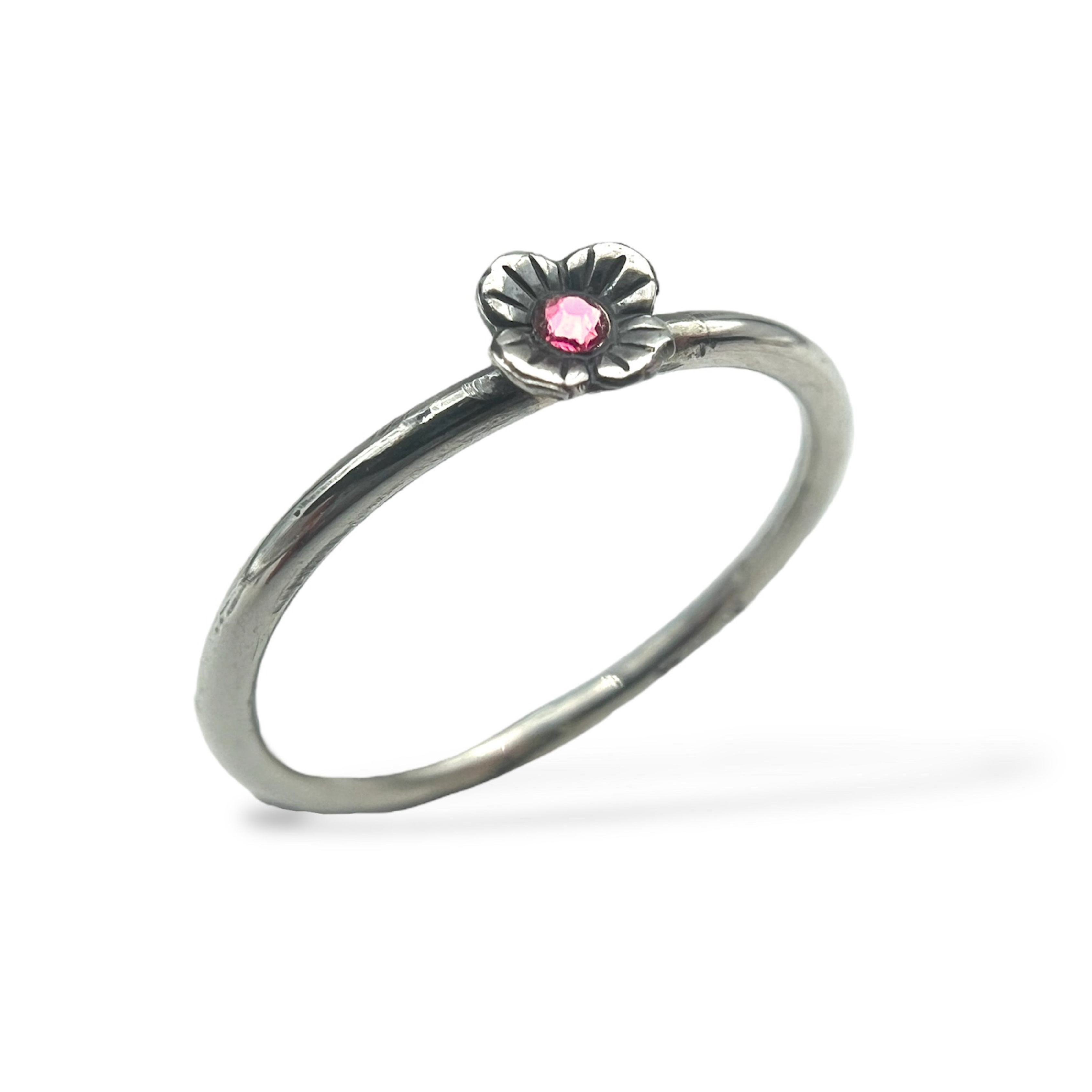 Beskrivelse Liten blomster ring med fire blader og krystall. Håndlaget på vårt lille verksted i butikken, derfor vil noen vaiasjoner forekomme. Disse er perfekt å kombinere med andre ringer eller bruke alene. Ta kontakt om du ønsker i annen størrelse eller farge. Blomst: 4,5x5mm Ringskinne bredde: 1,5mm Metall: 925 sølv, oksidert & krystall |