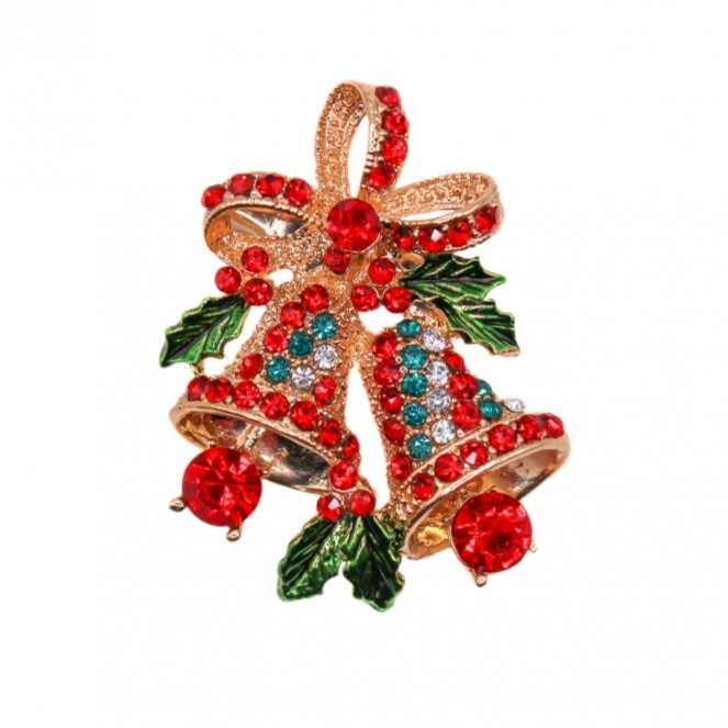 Julebjelle brosje i forgylt stål med grønn emalje og grønne og røde stener.