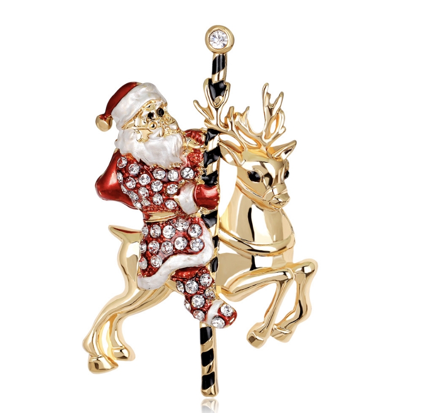 Julenisse og reinsdyr brosje i forgylt stål med Zirkonia og emalje.