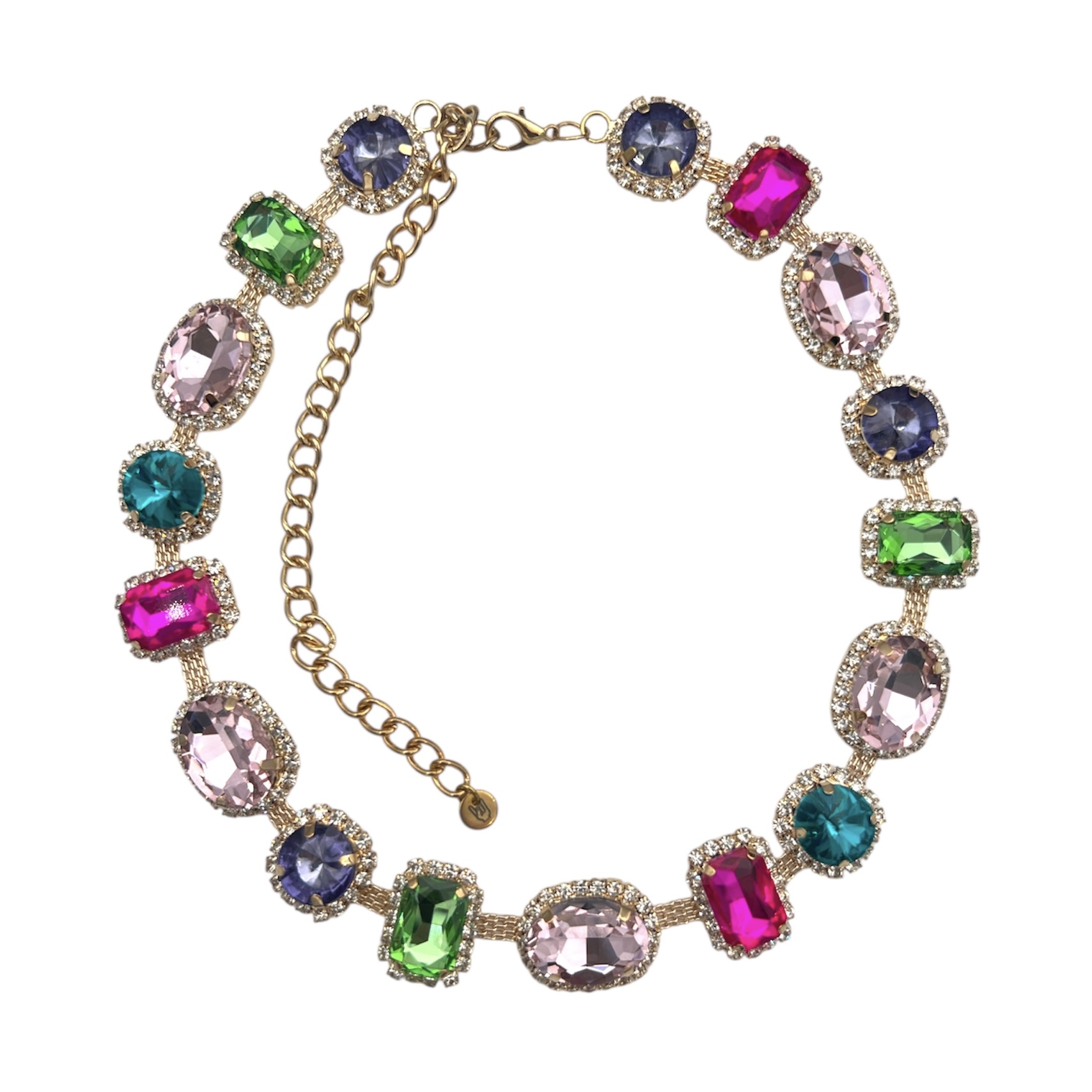 Beskrivelse F18K forgylt collier med multifargede stener. Farge: Multifarget / Forgylt / Klar Lengde: 40 cm + 5 cm Materiale: Brass / 18K forgylling / Stener Hvert smykke er gravert med GFJ på den ene siden og "You Rock" symbol på andre siden for å vise at det er et ekte GOLDFINGER JEWELLERY smykke. |