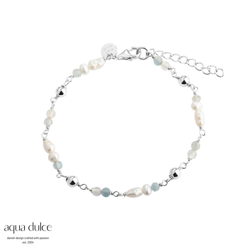 Beskrivelse Armbånd i sterlingsølv med aquamarin, zirkonia, sølvkuler og hvite ferskvannsperler. - 100% nikkelfri - 925 Sterling sølv - Lengde: 17cm + 3cm |