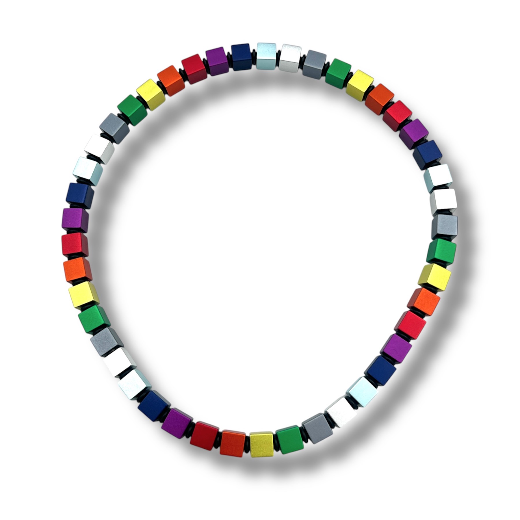 Beskrivelse Lengde: ca.42 cm Populært terningarmbånd eloksert aluminium. Størrelsen på terningene: 8×8 mm Farger i kjede: Rosa (RS), bringebær (HI), rød (RO), Lilla (LI), antrasitt (AN), titan (TT), marine (MA), turkis (TR), isblå (EI), lysegrønn (HG), neon (NE), gullfarge (GD) og mango (MG). |