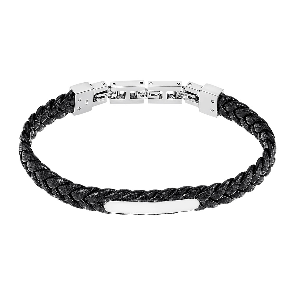 Armbånd i flettet skinn og stål med graveringsfelt, svart
