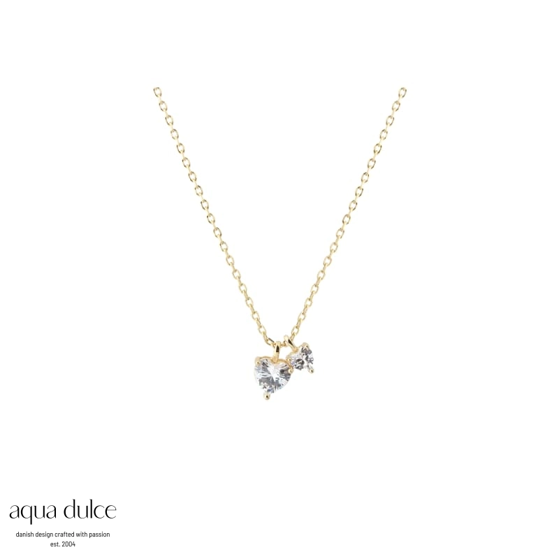 Forgylt sølv halskjede med to blanke zikonia hjerter.