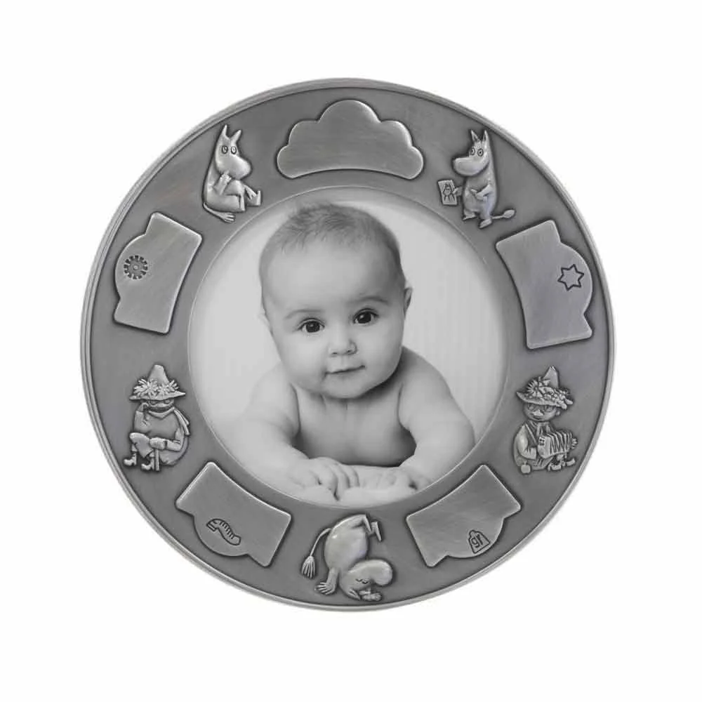 Beskrivelse Elegant og søt fotoramme i blikk med matt overflate med Mummi og vennen hans Snusmumriken. Rammen kan gis bort som en unik dåps- eller barselgave. En søt, personlig og minneverdig måte å oppbevare barnets fødselsdata på. Størrelse: 17,5 cm i diameter Bildestørrelse: 10 cm i diameter Gravering: Rundt rammen er det plass til å gravere navn, fødselsdato, fødselstidspunkt, lengde og vekt. Ta kontakt for gravering. |
