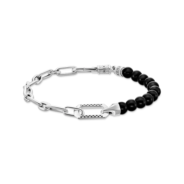 Beskrivelse Armbånd med svarte onyxperler og lenker i sølv - Armbånd for menn med perler laget av onyx og et lenkearmbånd laget av lett resirkulert 925 sterlingsølv, svartbehandlet - Justerbar lengde fra 16 til 19 cm Rebelsk klassiker: Dette armbåndet imponerer med en spennende fusjon av rundpolerte onyxperler og et lenkearmbånd laget av fremhevede, lett ankerelementer. Hummerlåsen og endene av perlearmbåndet er forseggjort skulpturert. Smykket kan justeres fra 16 til 19 cm for å passe til håndleddet. Med sitt enestående design gir det et individuelt preg til ethvert antrekk - båret separat eller kombinert med det matchende halskjedet. |