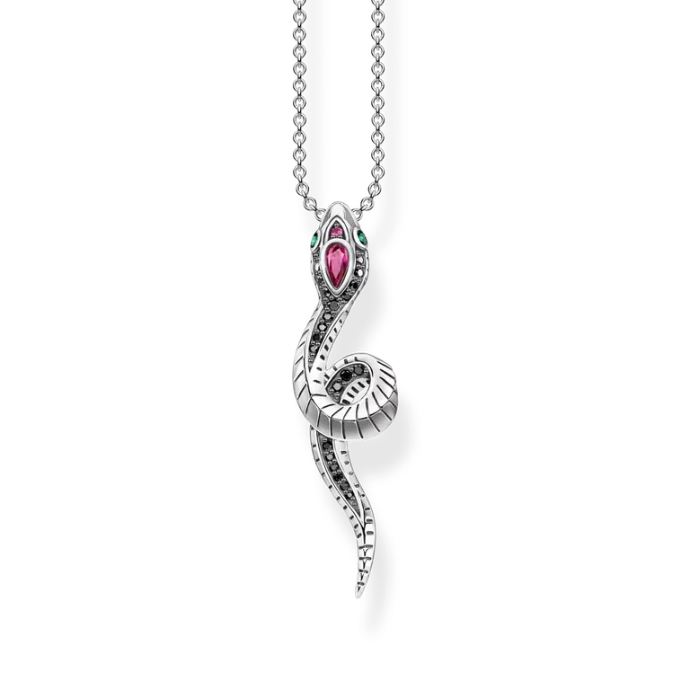 Beskrivelse Material: Sølv, 925 + cubic zirkonia Høyde: ca. 36,00 mm Bredde: ca.10,00 mm Kjede lengde: 40-45cm Strålende midtstein med dråpesliping Slangekropp dekorert med fine, grafiske graveringslinjer Slående svart-rød fargekontrast Symbol for forførelse, visdom og beskyttelse Designet med fokus på detaljer, skapt av presist håndverk Fås i sett med ankerkjede |