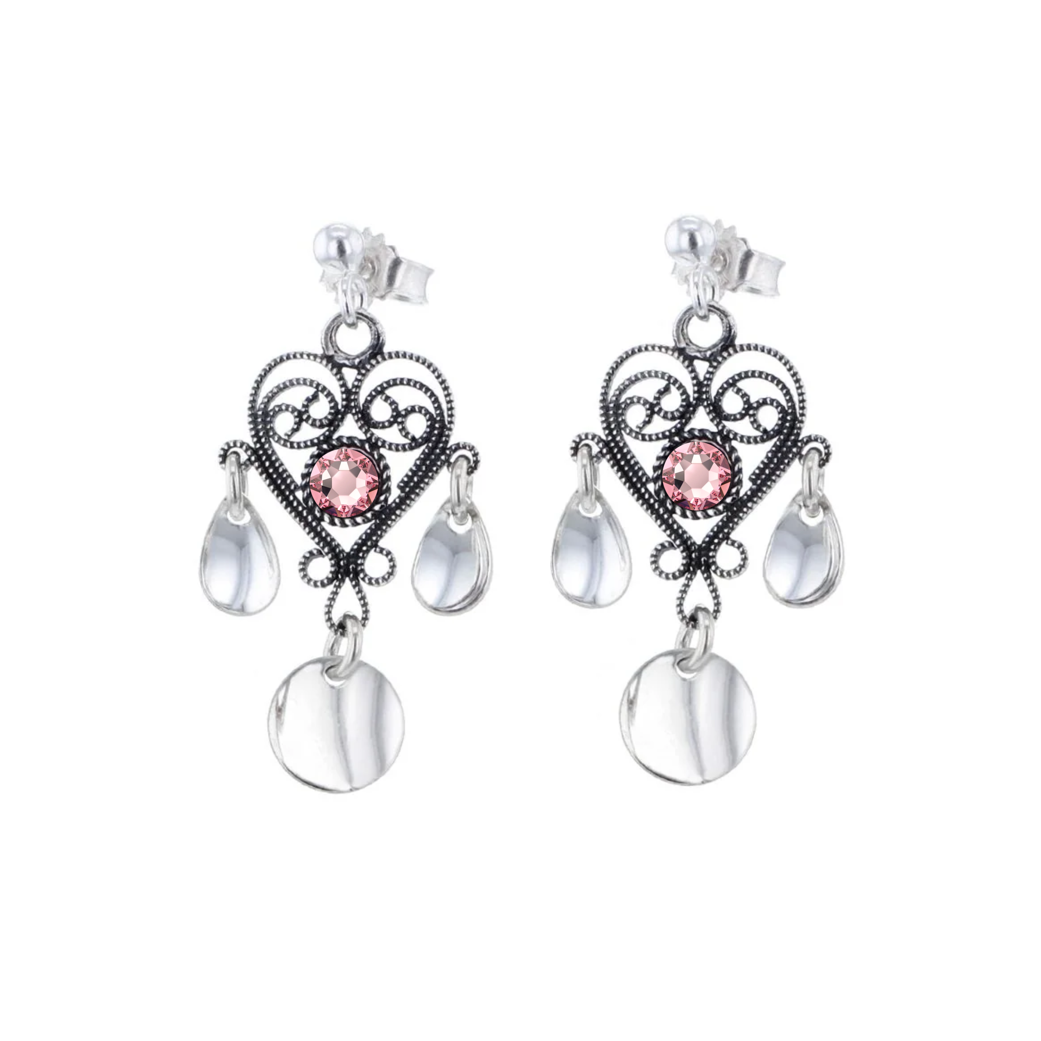 Hjerte ørepynt med lauv og krystall, oksidert/sølv - Lyserosa 05