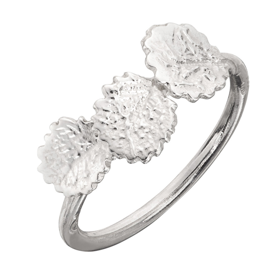 Beskrivelse 3 bjørkeløv danser elegant rundt på denne vakre ringen i uoksidert sølv 925. Ringen er detaljrik med detaljer som glitrer i sollyset. En ring som er tøff å bruke både på ring-, lang- og pekefinger. Fra str. 60 er det et påslag på pris på kr. 250,- Bilde lånt fra leverandør nettside: https://huldresolv.no |