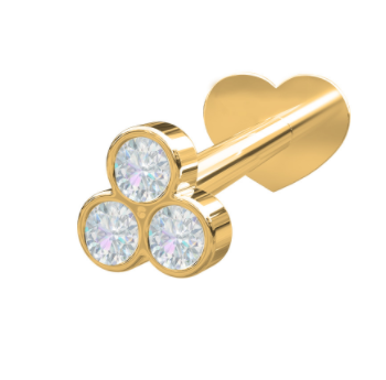 Beskrivelse Små ørepynt i 14.kat gull og tre 0,04 karat diamanter med flatback i hjerteform. Perfekt til de med flere hull i øret, eller som trenger noe mer langvarig og komfortabelt. Kun 1 stk! |
