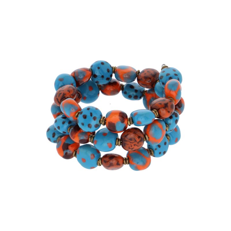 Beskrivelse Perlerne er trådet på fiskesnørre og låsen, samt mellemstykkerne er lavet i forgyldt kopper. Den er nikkelfri efter lovgivningen. Laget av keramink. Håndmalte perler fra Kenya. Bilde lånt fra www.KazuriSacndinavia.dk |