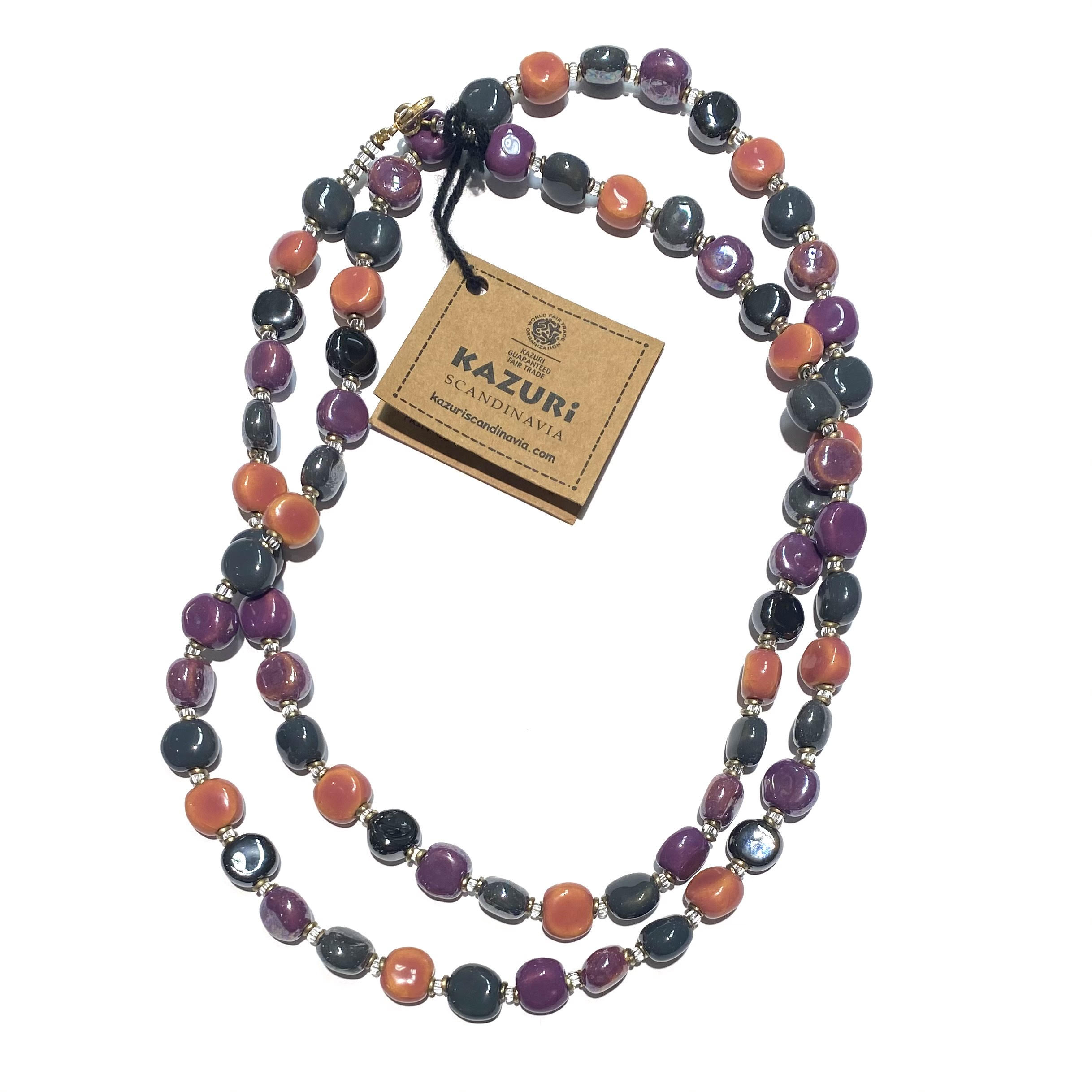 Beskrivelse Perlerne er trådet på fiskesnørre og låsen, samt mellemstykkerne er lavet i forgyldt kopper. Den er nikkelfri efter lovgivningen. Laget av keramink. Håndmalte perler fra Kenya. |