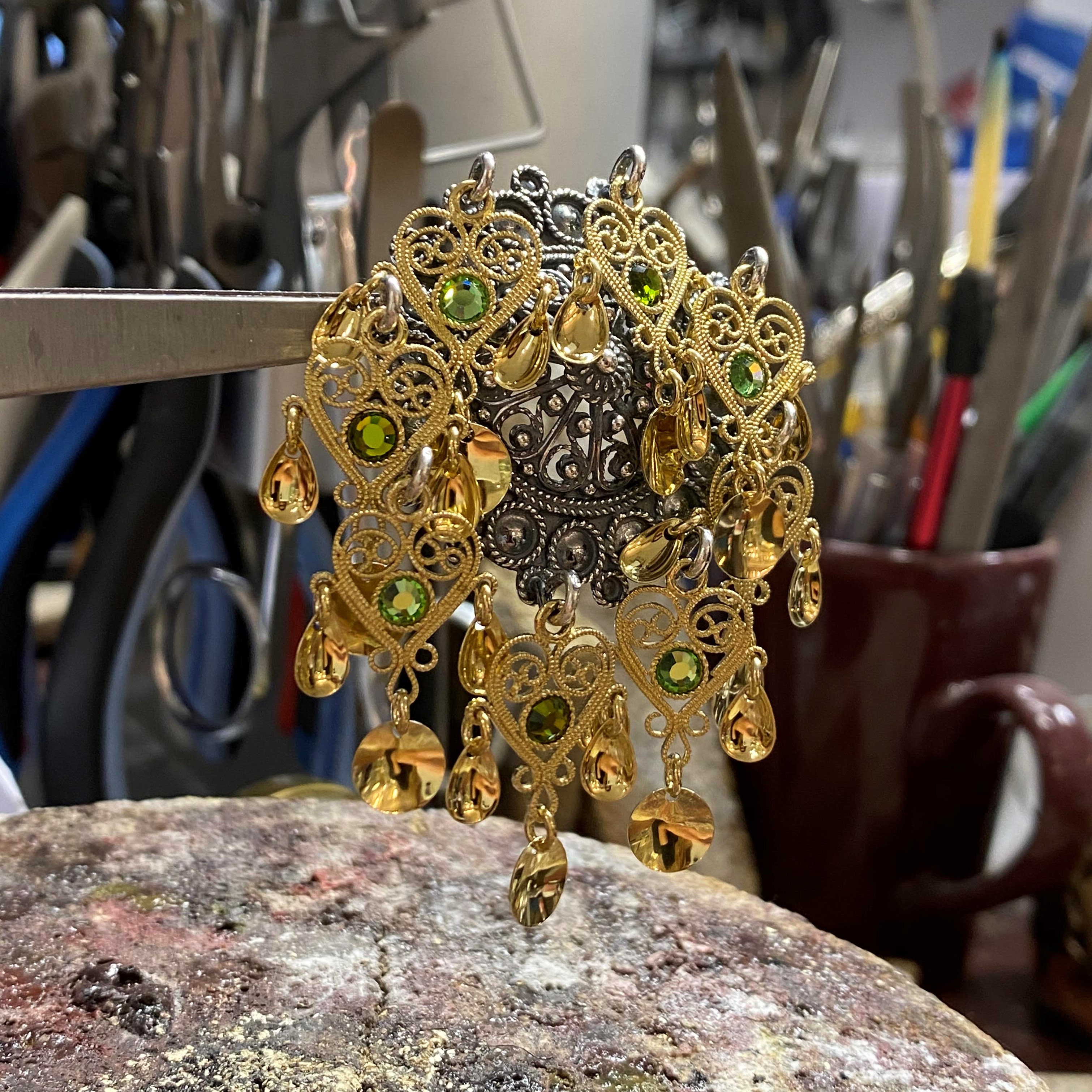 Oksidert sølje med hjarteheng og Swarovskikrystallar med forgylte lauv.