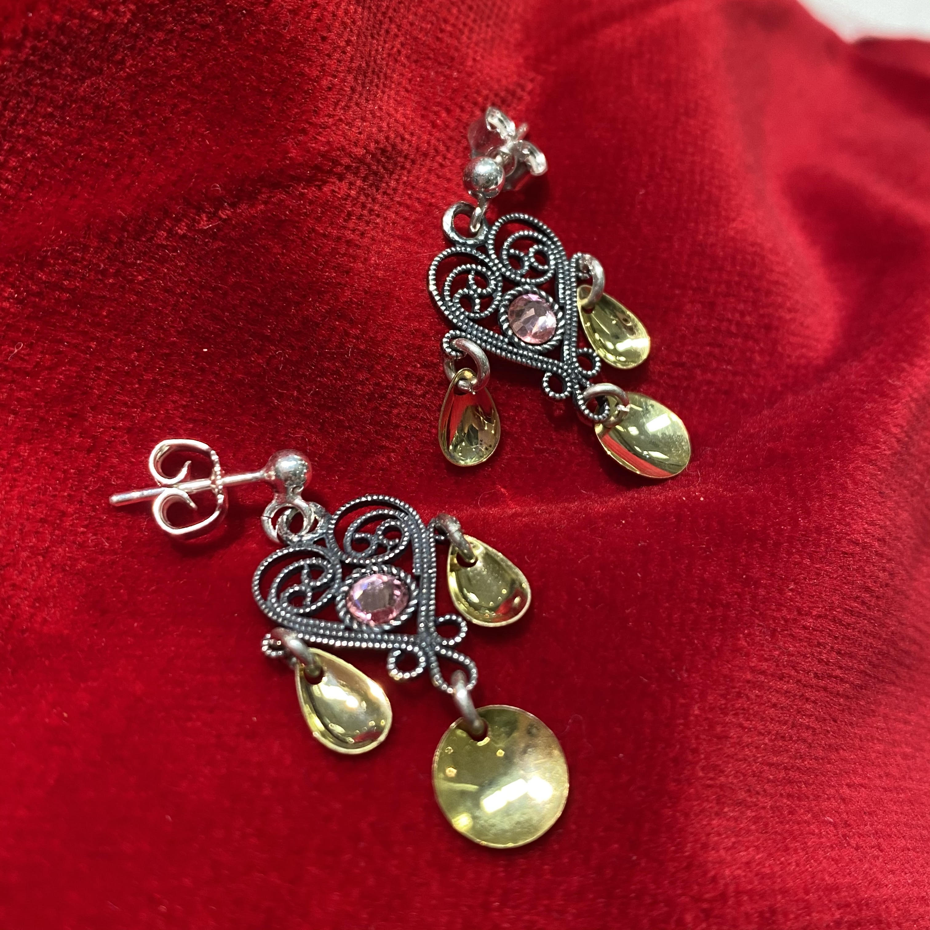 Ørepynt i oksidert sølv med stein og gylte lauv.