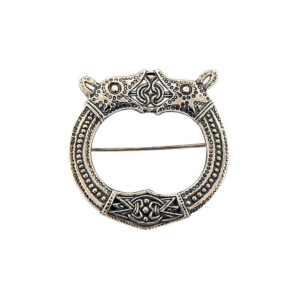 Beskrivelse SAGA-sølv-BROSJE-oksidert-“Drager”-Brosje i en usedvanlig rik og fantasifull komposisjon. Motivet viser et stort dyr, omgitt av en ormefigur som snor seg rundt det. og symboliserer antagelig kampen mellom gode og onde makter. Utført ca. 1000 e. Kr. Funnet ved Eiriksmyr, Eidanger i Telemark |