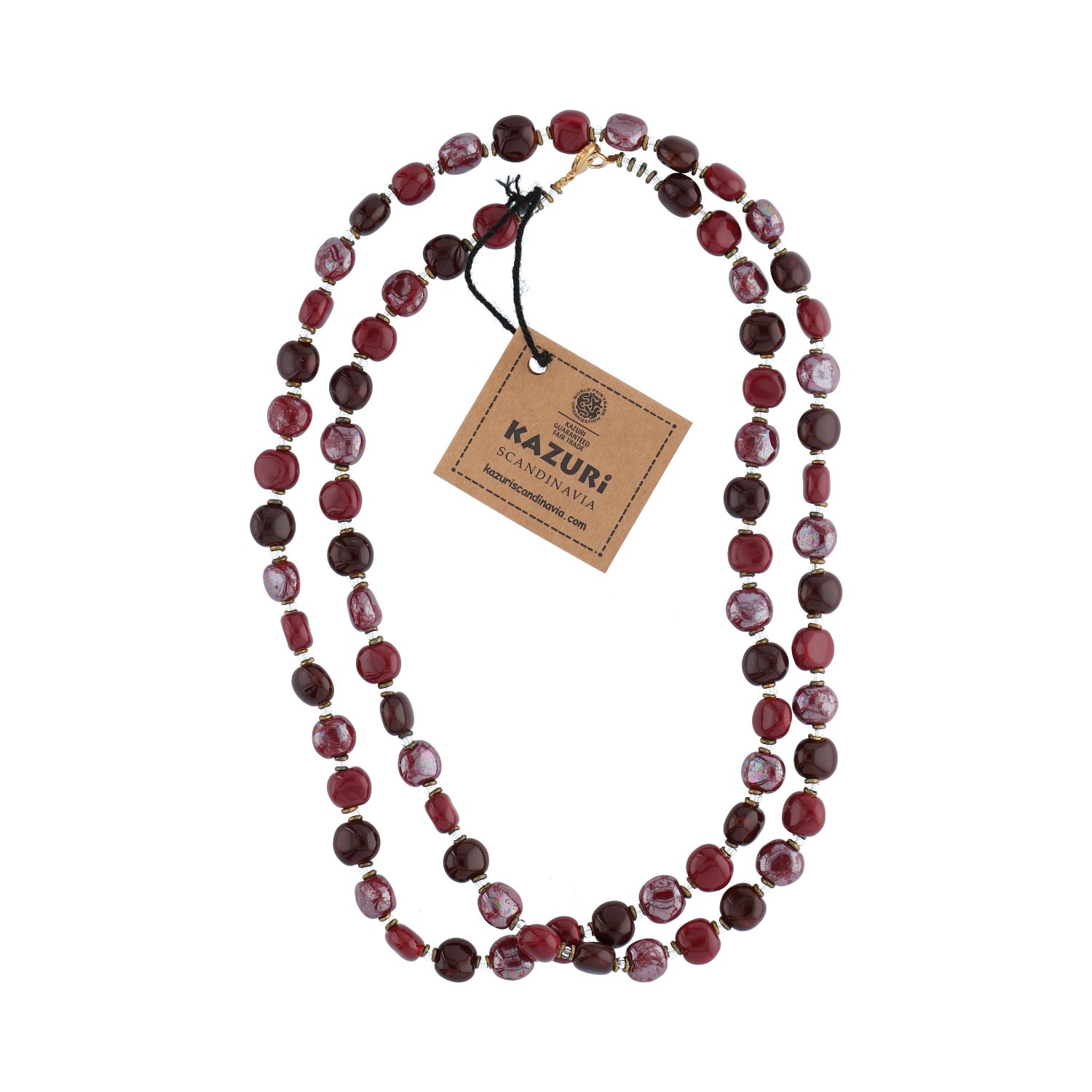 Beskrivelse Perlerne er trådet på fiskesnørre og låsen, samt mellemstykkerne er lavet i forgyldt kopper. Den er nikkelfri efter lovgivningen. Laget av keramink. Håndmalte perler fra Kenya. |