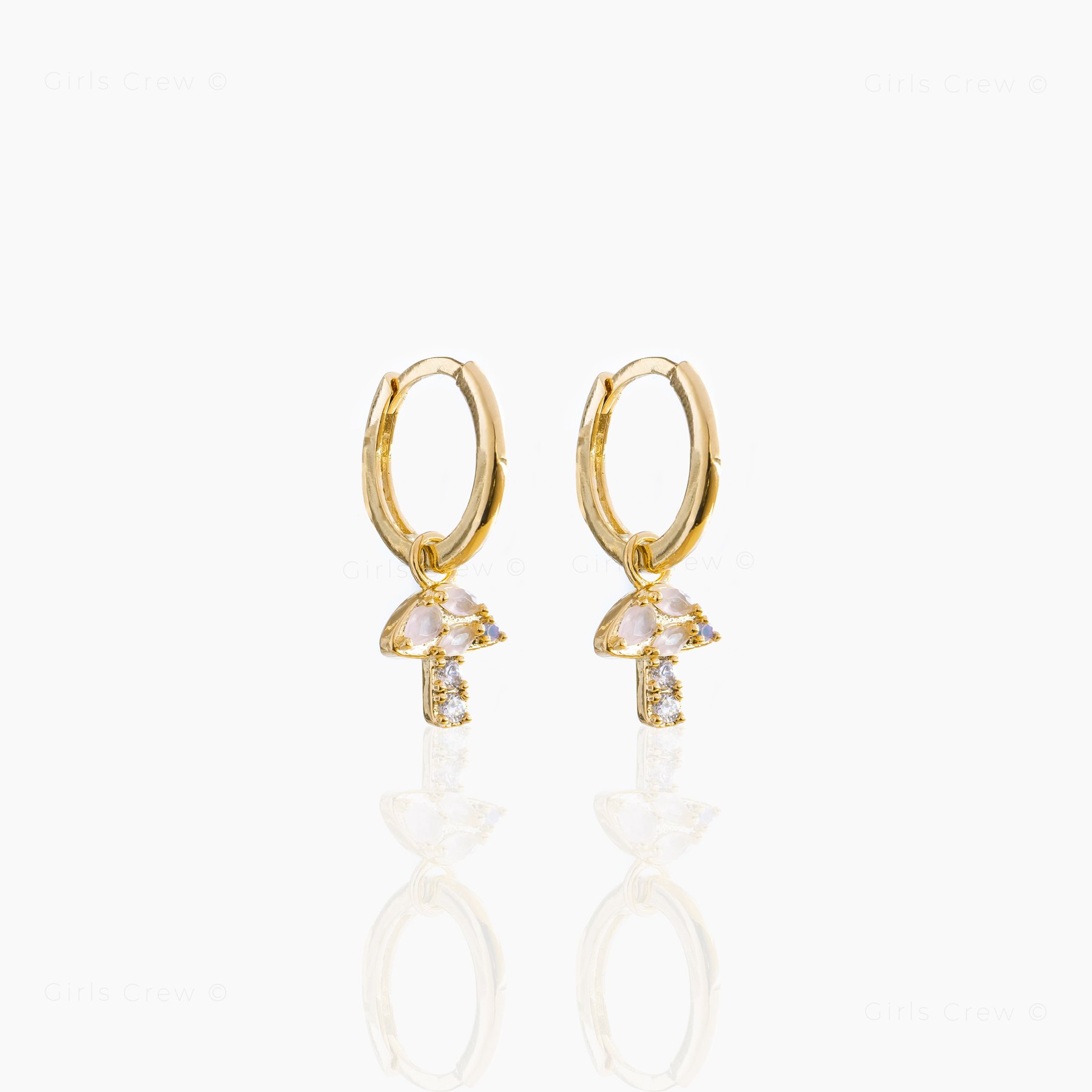 Beskrivelse Ta et par av disse psykedeliske soppbøylene! Du elsker soppdesignet vårt, så vi måtte gi deg disse radbøylene! SELGES SOM PAR! 18k gullbelagt, 18k rosegullbelagt eller rhodiumbelagt over messing med et beskyttende belegg Cubic zirconia steiner 12 mm bøylediameter, 12 mm sjarmfall Sterling sølv stolper Bilde lånt av leverandør. |