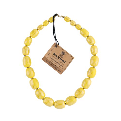 Beskrivelse Perlerne er trådet på fiskesnørre og låsen, samt mellemstykkerne er lavet i forgyldt kopper. Den er nikkelfri efter lovgivningen. Laget av keramink. Håndmalte perler fra Kenya. Bilde lånt fra www.KazuriSacndinavia.dk |